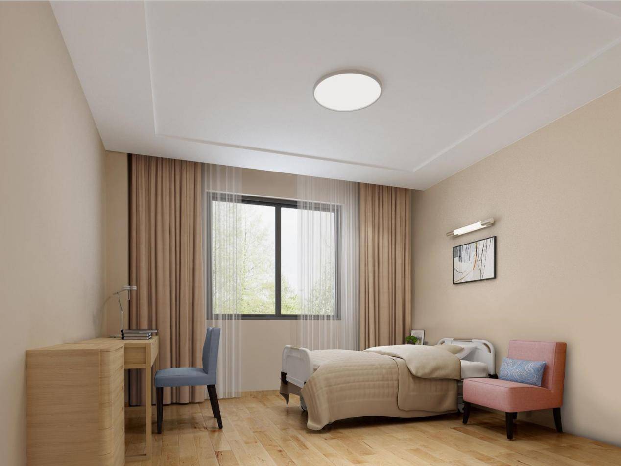 老人房间设施:护理床、呼叫器、储物柜、床头灯、电视、空调、冰箱、电话、独立卫生间、热水器、洗衣机、采暖、新风系统、智能监测设备、书桌