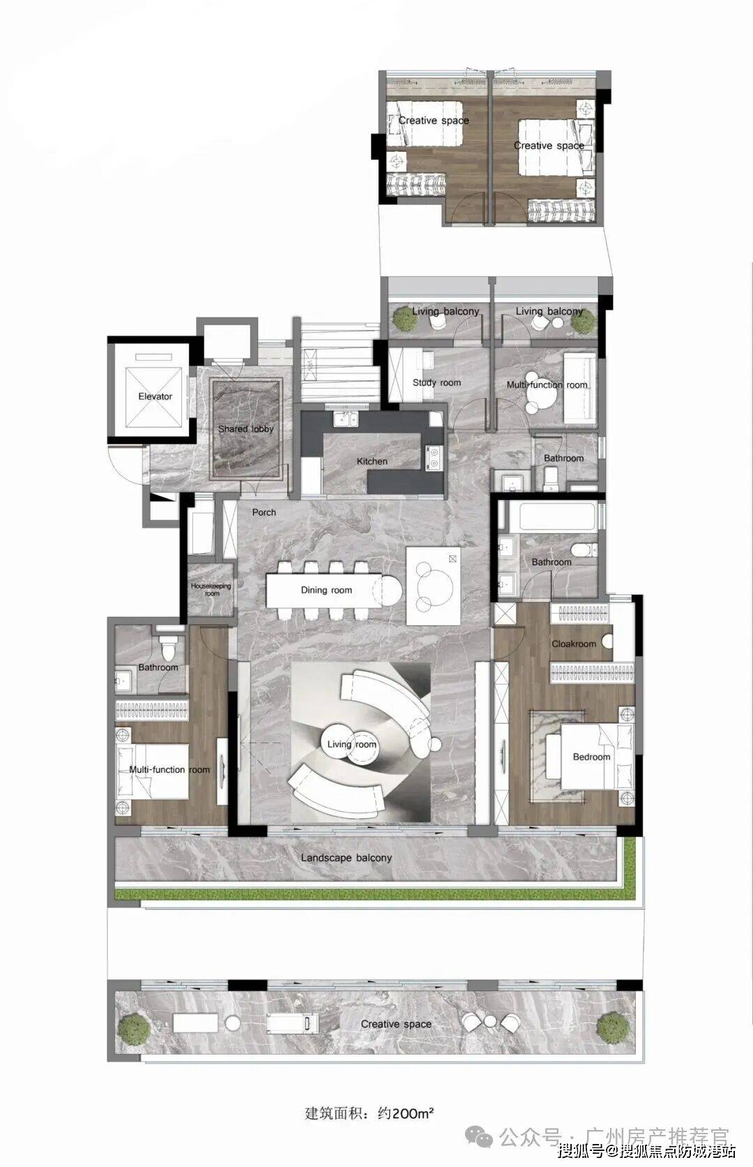 上叠户型位于三楼和四楼,采用复式设计。三层主要用作会客功能,四层则是纯粹的休息区。最引人注目的是其约180平方米的星空露台,拥有270°的广角视野,可以俯瞰整个河景。向上多功能空间的设计,为家庭提供了更多的想象空间。约10米的阔绰横厅,南北双露台的配置,让居住者可以尽情享受阳光与微风。