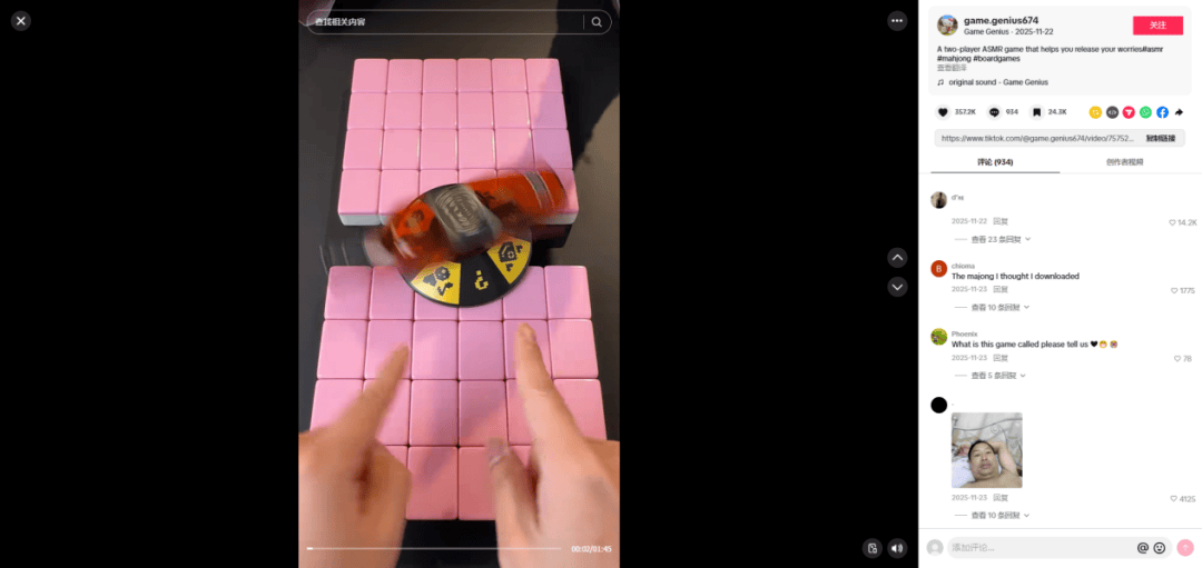 TikTok博主@game.genius674一条麻将消除视频播放量突破3790万,点赞超73万,直接让Doremimall网站上一套售价45至120美元的麻将套装成为爆款。