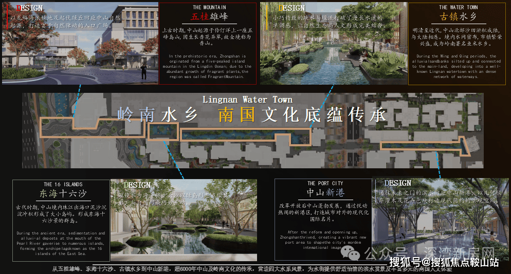 滨水街区中,从五桂雄峰、东海十六沙、古镇水乡到中山新港,超6000年中山及岭南文化的传承,营造四大水系风景,为水街提供舒适怡情的滨水赏景及丰富多元的南国人文体验。这就像是打开一个历史卷轴,从西侧到东侧,看到中山历史到现代的演变过程,亦见证了中山不断向东发展,向湾区融合的美好图景。
