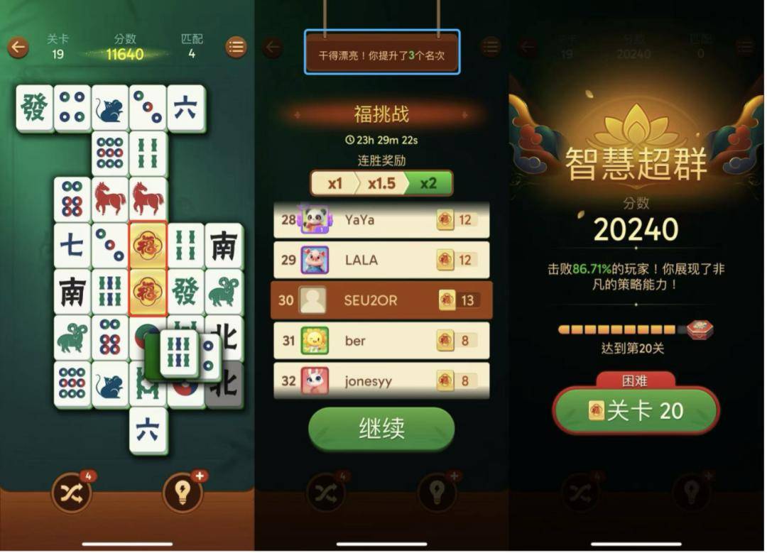 红框里是特殊牌,有福牌、熊猫牌等样式(图 1),排行榜系统“挑战”(图 2),关卡结算画面(图 3)