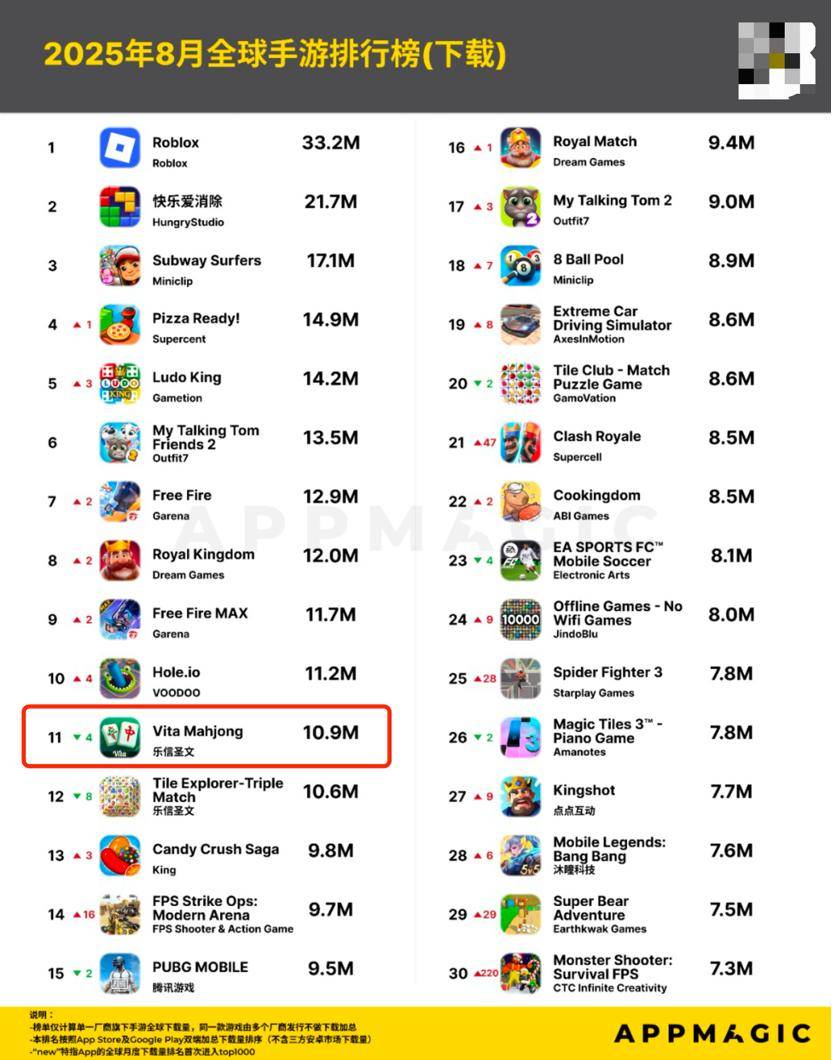 开元棋牌,开元棋牌官方网站,开元棋牌APP下载在 AppMagic 给出的 2025 年 8 月全球手游下载榜中,一款名叫「Vita Mahjong」的产品,赫然在列,排名第 11 位,从 Icon 来看,这是一款麻将题材的手游,且根据 AppMagic 的数据,在短短一个月的时间里面,拿到了 1000 万+次的下载。