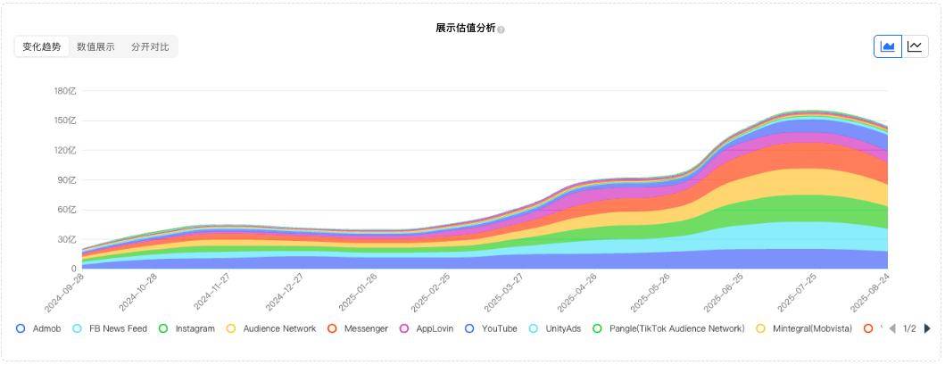 而从投放策略看,无论是地区,还是投放渠道,Vita Mahjong 的都比较平均,而近期,月展示估值接近 140 亿次,整体广告投放的力度是相当大的,“广告投放-高下载-IAA 变现”是「Vita Mahjong」的主要路径。