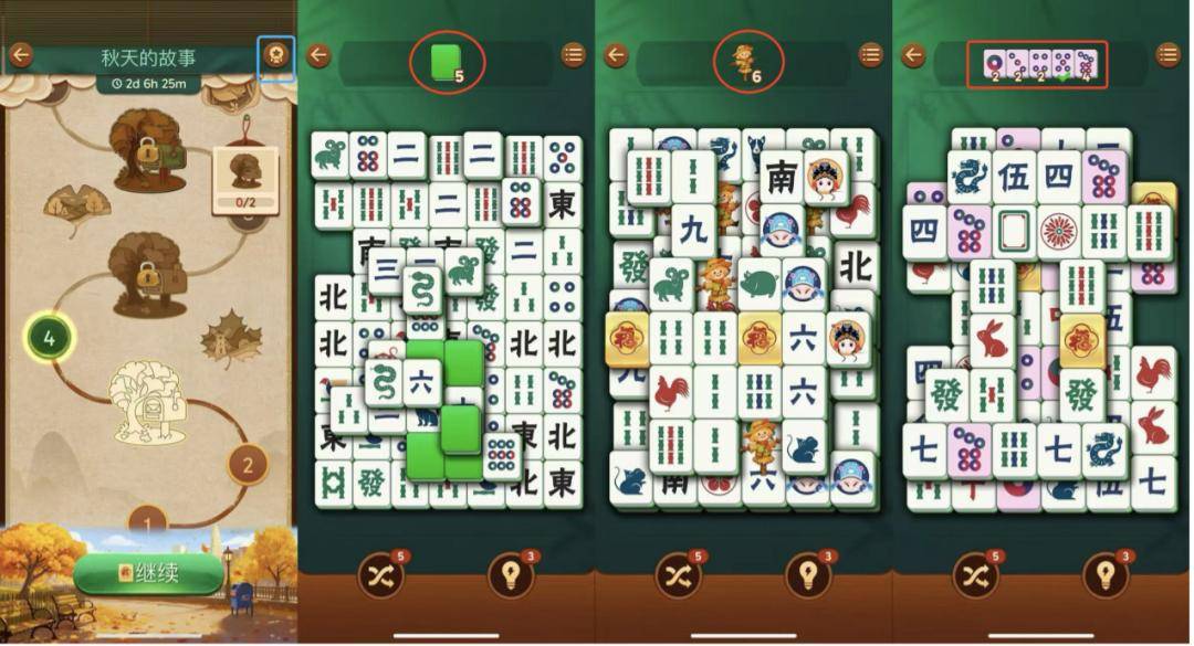 相比之下,如上图的「Mahjong Club」,仅是牌数较少的第三关就出现了 “2 对西风、白板”,虽然后续也加入了“梅兰竹菊、春夏秋冬”8 张花牌,但仍会大量出现重复情况。而由于生肖、脸谱等牌面的加入,「Vita Mahjong」在后面关卡堆叠数量较多时,才会出现重复。